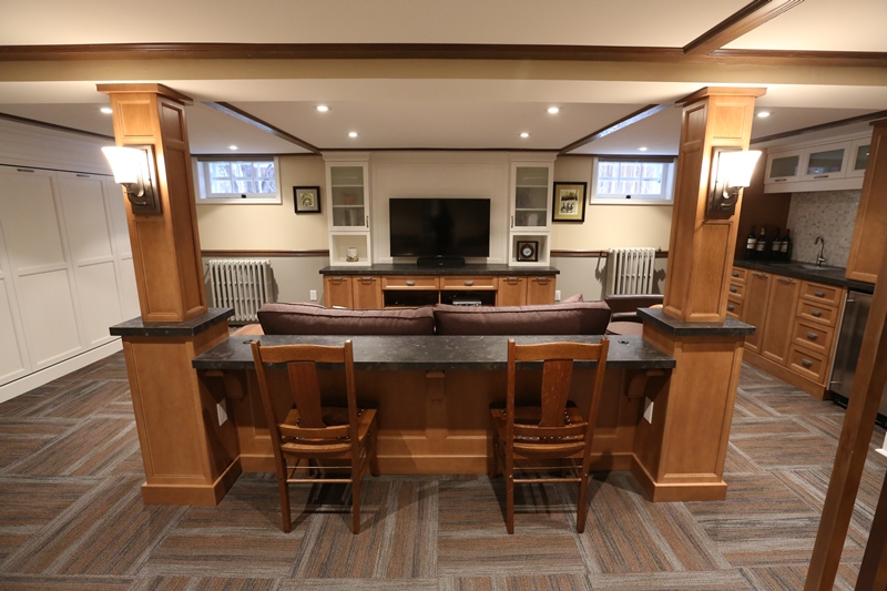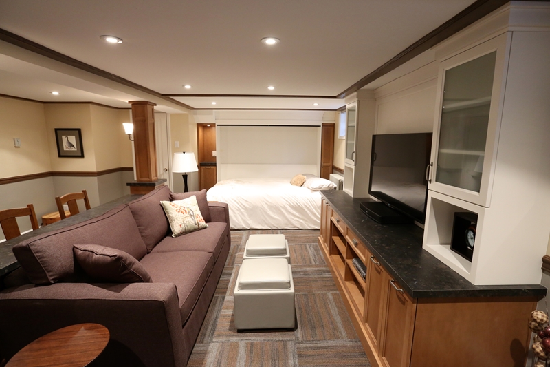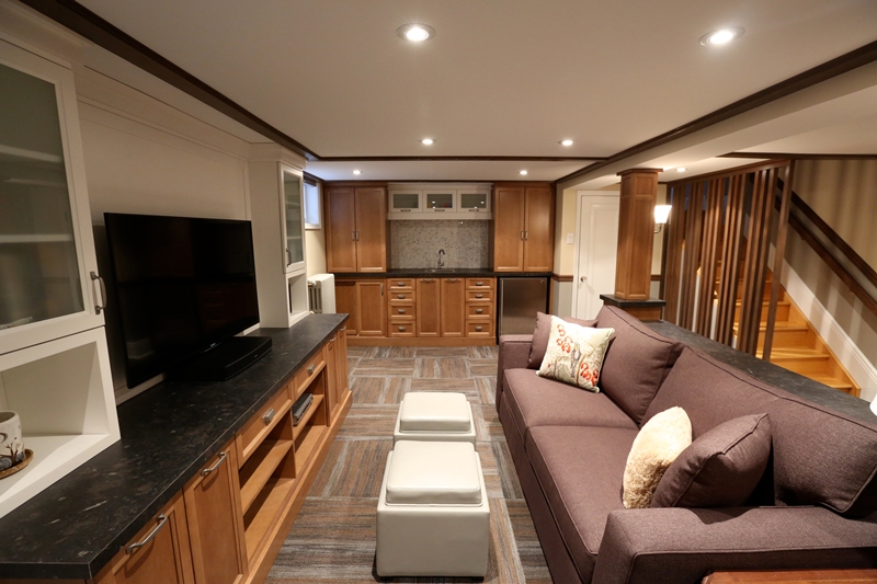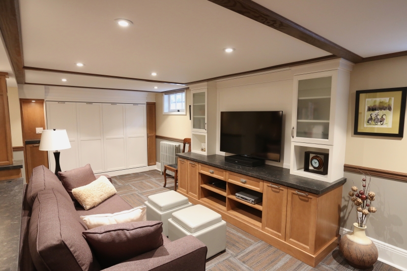 Perhaps one of the most dramatic basement renovations we have designed, this client wanted their otherwise under-utilized lower level to be comparable in level of design and features to the remainder of their recently renovated River Heights home. Mission accomplished! The newly revitalized space accommodates a media area which transforms into a private guest suite with the addition of a cleverly concealed murphy bed. A new laundry room and 3 piece bathroom make use of formerly less desirable spaces and the integration of craftsmen details and finish considerations seamlessly link the lower level and main level as per the design directive.