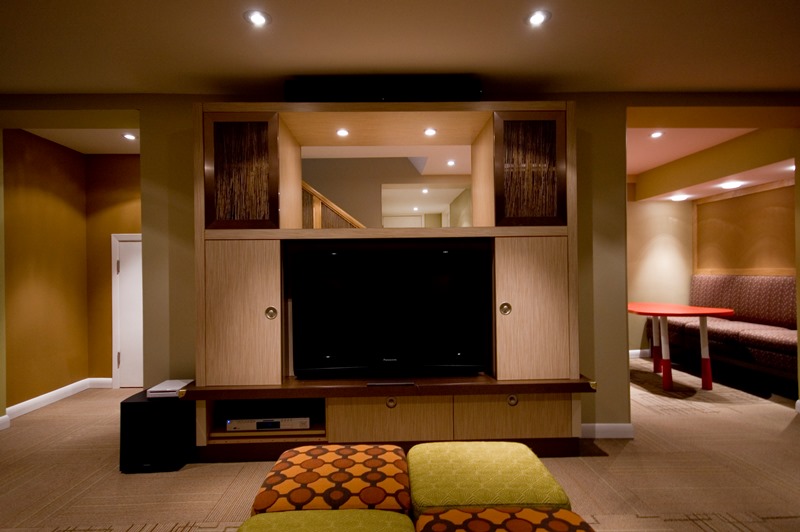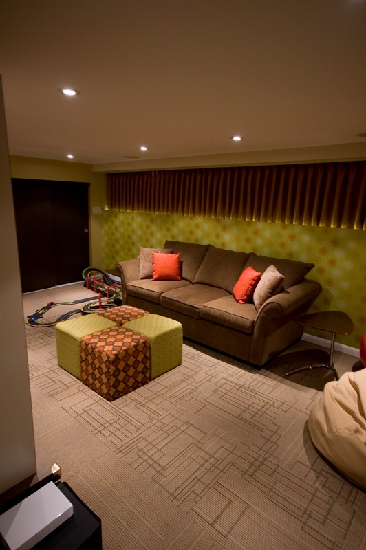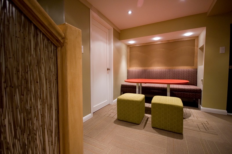 Another return client. After having designed a number of spaces throughout this clients’ home, IDEATE was engaged to redevelop the lower level of their home into a space that their children and friends could use for play, movie and television viewing, and playing/storage of numerous games, toys and sports equipment. A low ceiling height was a major challenge, but through careful design consideration of lighting and ceiling materials, as well as zoning of play spaces, the space that we created affords separate play spaces for several children simultaneously. The finishes and colours are fun and fresh, and there is ample storage for toys behind doors and drawers. As the kids grow and their tastes change, the design will continue to work for them and be a safe haven for them and their friends, out of ear-shot, but within the watchful eye of mom and dad.